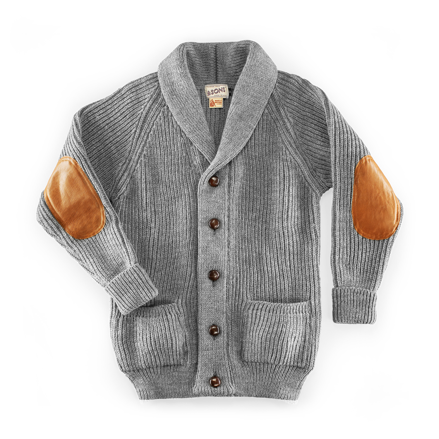 This Classic, shawl neck cardigan gives a relaxed look to your style, with a new twist… &SONS have added Canada Tan Calfskin leather elbow patches with double stitching.