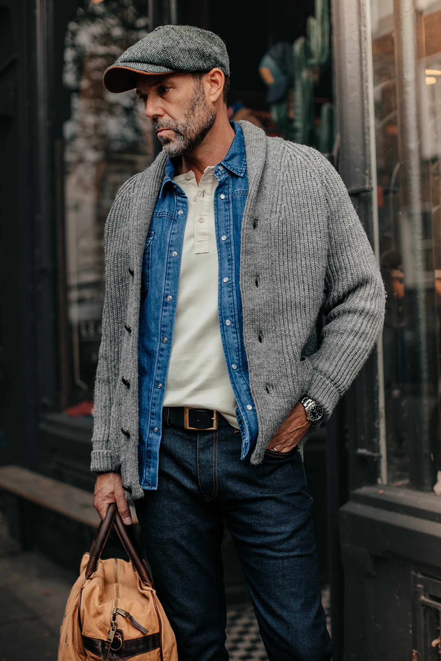 The Cardigan features a ribbed collar, cuff and hem, as well as the classic 5 leather buttons on the front. This is comfort, warmth and style in one garment. It also works perfectly with one of &SONS waistcoats/ jackets underneath or the Boardwalk Peacoat on top for an awesome layered look. Designed and made in Britain - Produced for &SONS by a family business who blend traditional talents with 21st century wool for versatile heritage.