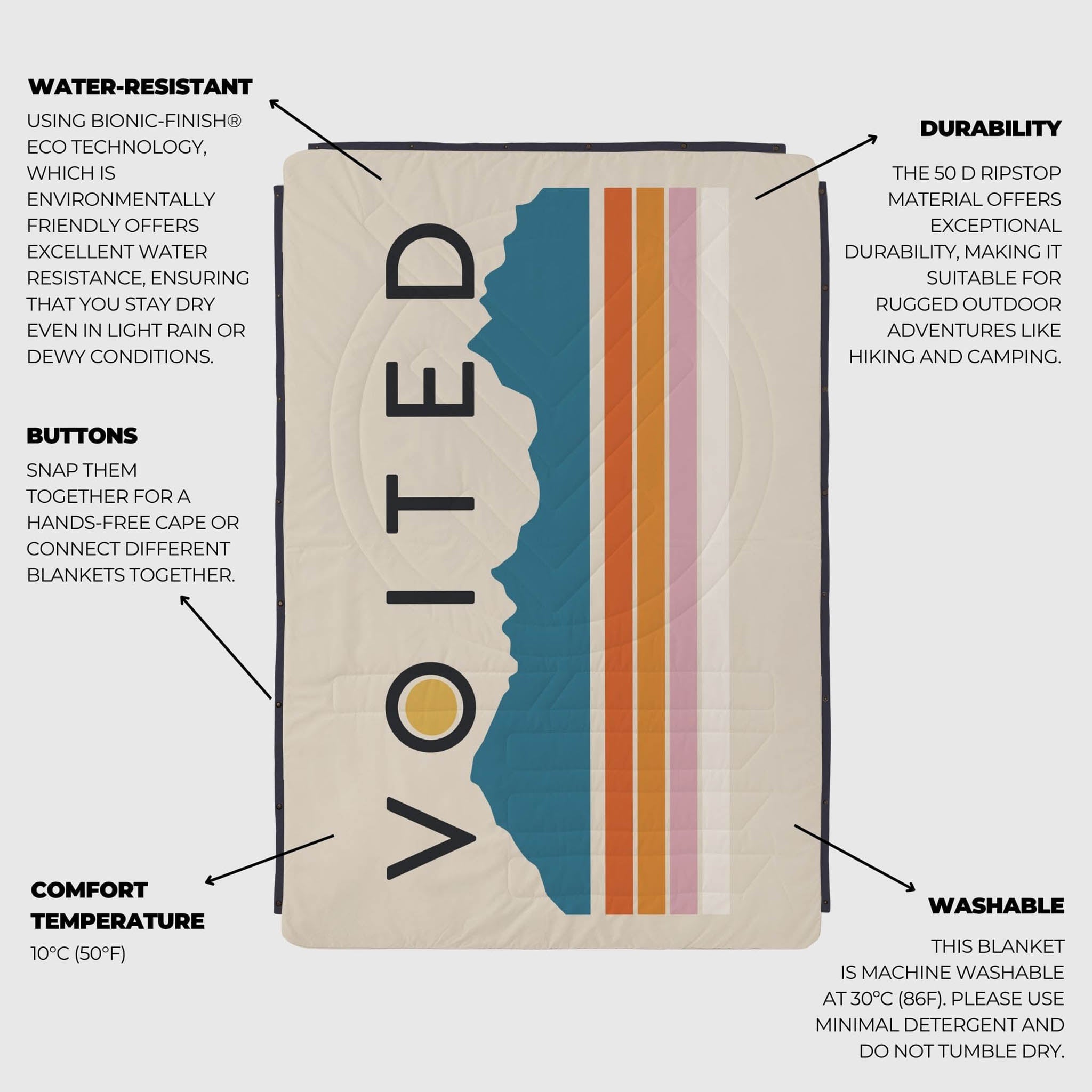 Ethically Sourced Materials - Made from 100% Recycled REPREVE® fabric. Voited strive to use the most environmentally friendly fabrics possible their manufacturing process. For their outdoor blankets, they have replaced nylon made from oil based plastic chips with REPREVE®, the leading performance fibre made from recycled materials (including plastic bottles).