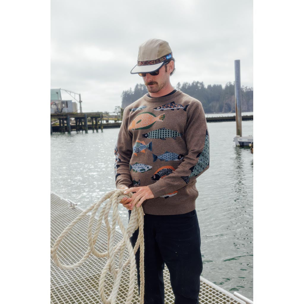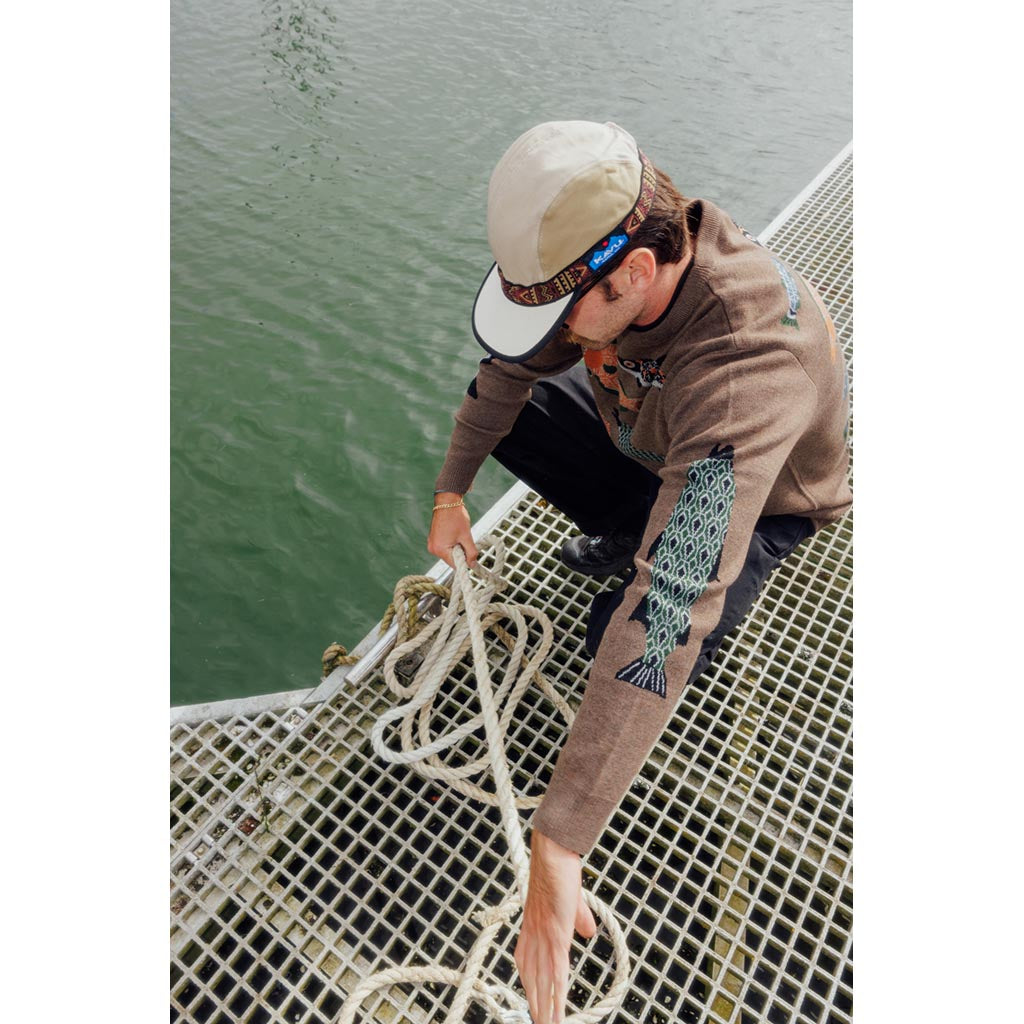 Now here’s an origin story for you. Back in the early nineties, fishing boat skipper Barry Barr was fed up with wearing cheap trucker caps that got snatched off his head in storms, never to be seen again. He decided to make a super-durable cap that wouldn’t blow off whatever the weather, and he did it by stitching the webbing material from a Teva sandal all the way around the crown. Turned out his ‘Strapcap’ was a hit, and KAVU was born.