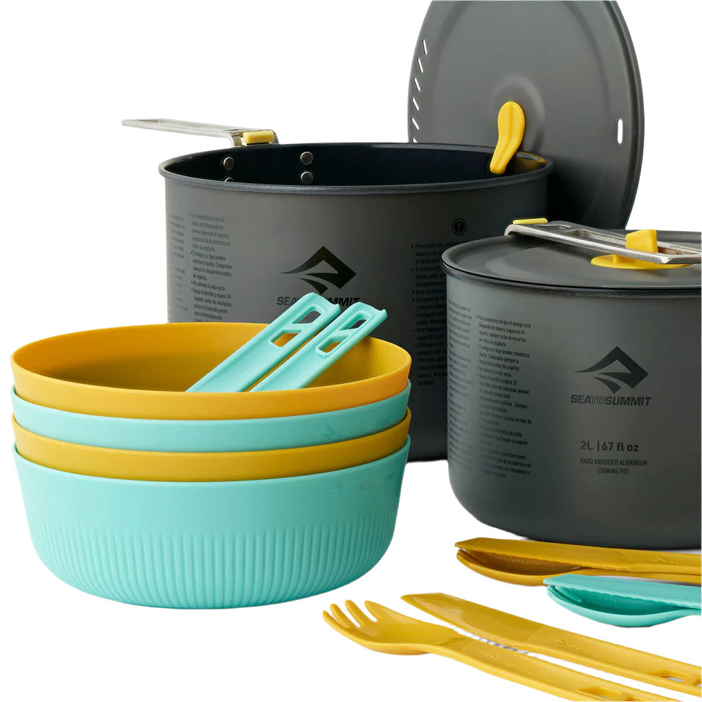 If you regularly head out on adventures with the family or a group of friends, you’re gonna need cooking capacity for multiple people – which normally comes with added weight. The solution is Sea to Summit’s Frontier Ultralight Two Pot Cook Set, a lightweight kit consisting of two large, hard anodised aluminium pots, plus four medium bowls as well as sets of sporks and knives made from tough reinforced polypropylene. The 2L and 3L pots feature abrasion resistant non-stick ceramic coatings that contains no nasties like PTFE or PFOAs, while all tableware is BPA-free. The removable handles lock securely into place during use and can be reversed over the lids for compact packing and easy transportation. Meanwhile, the smaller pot, bowls and cups all nest neatly inside the largest pot for space-saving efficiency.