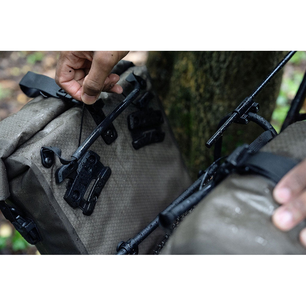 Sometimes you only need capacity on one side, or you're building up your touring setup bit by bit. Ortlieb's single gravel pack uses the brilliant QL3.1 system – studs that mount directly to QL3.1-compatible racks, meaning you can hang and release the pannier with just one hand. No protruding hooks on the back means a completely smooth profile against your frame, and the whole mounting arrangement is lighter than traditional hook systems. You get 14.5 litres of carrying capacity in a waterproof ripstop nylon construction with practical Scotchlite reflectors for extra visibility on road sections. And all for a weight of just over 500g. The pannier comes with QL3.1 studs included; if your rack isn't QL3.1-compatible, you'll need the optional mounting kit.